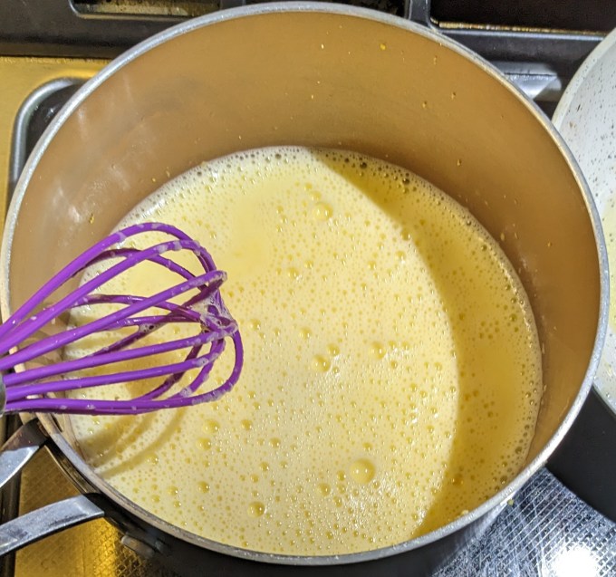 Eggs, egg yolks, and sugar are whisked together. Lemon juice and zest are heated until steaming. The hot lemon juice is slowly added to the egg mixture, whisking constantly, to temper the eggs. Once the liquid is fully incorporated, the entire mixture is returned to the stove and heated on medium, whisking constantly.
